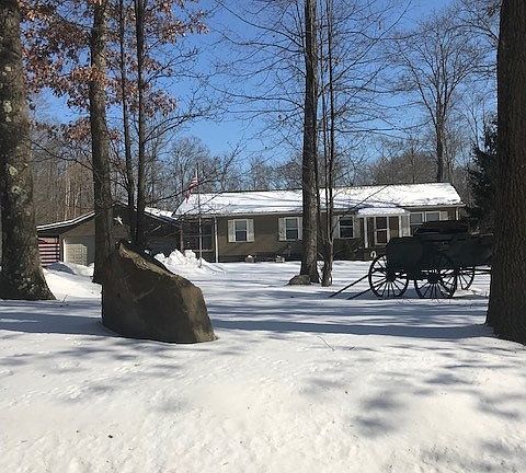 Take a look! Large ranch with many FUN outbuildings! Large kitchen, sweet sun room, woodburning fire place, open floor plan. Great master bedroom with a large bathroom and custom glass shower, just a few steps from the hot tub. Quiet outdoor space, private and room to roam. In ground dog containment fence. Outstanding 30x50 3 stall garage, with an unusual attached enclosed gardening/potting shed. Raised planting beds surround an addition 12x20 shed with electric.
