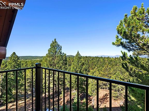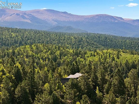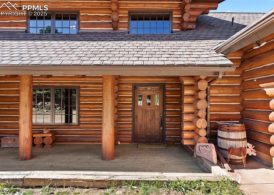 Perched near picturesque Raspberry Mountain, this stunning log cabin offers the ultimate mountain retreat amidst inspiring rock formations, whispering pines, and wildlife. Enjoy direct access to hiking trails and unparalleled opportunities to connect with nature. With sweeping mountain and forest views in every direction, the property seamlessly blends rustic craftsmanship with modern comfort. A spacious porch invites you to bask in the morning light or savor the magic hues of evening sunsets. Expansive floor-to-ceiling windows frame the surrounding forest, wildlife, and dramatic Rocky Mountain landscapes, while a private main-level balcony off the primary suite provides even more beautiful views. The walkout stone patio extends your living space to the outdoors — perfect for stargazing or hosting gatherings beneath the Colorado sky. Inside, the log-cabin style and architecture plus natural stonework create a cozy yet grand atmosphere. Vaulted ceilings and gleaming, heated hardwood floors are the perfect complement to the log construction, and a woodfire stove anchors the great room…offering comfort on crisp nights and a front-row seat to winter’s most picturesque snowfalls. The adjoining kitchen blends rustic charm with functionality, featuring a built-in gas grille, generous pantry, and abundant food storage. Its seamless design allows easy flow to both the main living areas and outdoor patio for entertaining and relaxation. There are five bedrooms thoughtfully divided between the loft upper level and the cozy and carpeted basement with open flex-space for additional living or recreation. The oversized garage and ample utility space provide loads of storage opportunities and plenty of room for “mountain toys” like 4-wheelers, etc.! Even though you feel like you are completely tucked away, this location is super convenient…less than 10 minutes to Mueller State Park and the town of Divide, and less than 15 minutes to the Colorado Wolf and Wildlife Center.