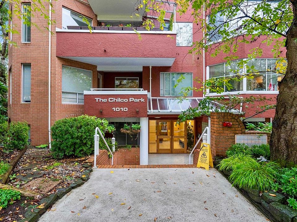 Welcome to The Chilco Park! You will appreciate spacious living with this ground floor 2 bedroom 2 bathroom condo with 1040 square feet. This unit is move-in ready featuring updated bathrooms, and SS kitchen appliances. Great layout with bedrooms spaced well apart, open dining and living rooms and bright kitchen with windows. Other features include fresh paint, a gas fire place and an additional private off-street entrance. Fantastic location! You're just a short stroll away from English Bay, Stanley Park, and all of the amazing benefits of West End living! Well run strata welcoming one pet (dog or cat) and unit comes fully equipped with additional private storage and a secure parking stall with EV charging port