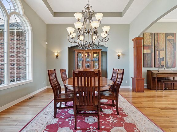 Lavish lifestyle! This show-stopping home is one to see! Stepping inside, you’re greeted by a grand entryway with beautiful Lyptus flooring and views of the main floor. Right off the entry is the home office, complete with French doors, and the formal dining room. This wonderful setting features arched doorways, specialty ceilings and custom built pillars for added detail. This space is truly wonderful for entertaining. Moving further into the main level, you’ll enter the spacious great room with soaring ceilings, impressive floor to ceiling built-ins, and massive windows, allowing the natural light to pour in and offering a fantastic view of the backyard. This amazing area also features a stunning fireplace that anchors the space. Continuing through the main level, the chef’s kitchen offers plenty of high-quality cabinetry, commercial grade appliances, granite countertops, and a large center island. The eat-in space is flanked by windows on all sides, making it the perfect place for dining. Just off of the kitchen is an enclosed porch offering even more great views of the rear yard and access to the custom-built patio. The main floor also boasts the expansive primary suite, providing a private retreat. The primary bathroom features a garden view jacuzzi tub, walk-in tiled shower, dual vanities, and a walk-in closet. Right off of the garage and finishing the main level is the mudroom, complete with plenty of high-end cabinetry, a convenient, guest half bathroom, and the laundry area. The sprawling walkout lower level is perfect for entertaining, featuring an expansive family room and rec area. With three additional bedrooms and two full bathrooms, this home is focused on keeping the living space the center of attention. Moving to the exterior, you will appreciate the attention to detail, as this property offers a tree-lined lot, meticulously maintained landscaping with a gorgeous patio, impressive retaining walls, and plenty of areas for high-end outdoor living. This backyard is truly remarkable! This one of a kind home was custom built by Craig Freesemann, Freesemann Construction, and also features an oversized, attached three-stall garage and more! With endless amenities, no detail was left untouched! If you would like even more space to roam, there is an additional .76 acres adjacent to the property available for purchase! Don't delay on this beautiful property, schedule your showing today!