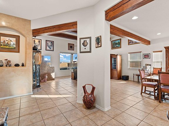 Welcome to this hidden gem in Rio Rancho. In a small private and gated community, you will find a 3 bedroom, 2 bathroom home with many custom touches. Tall beamed ceilings welcome you into the spacious living areas. This home has tile floors throughout the entire home, and full ADA access. Radiant heating and refrigerated air ensures you will stay comfortable year round. Enjoy the views from the backyard which overlook the Sandia Mountains and Rio Grande Bosque, perfect for Balloon Fiesta viewings. A large finished garage with an additional 30' RV garage space allows for sufficient storage.