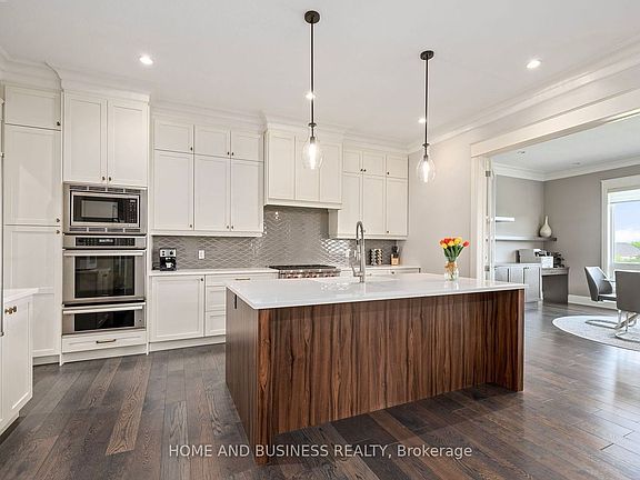 Custom-designed home offering over 5500 sq.ft of living space Situated on a 13,982 sq. ft STUNNING RAVINE WALK-OUT Massive LOT! This property is truly one of a kind. Featuring top-of-the-line appliances valued at $50,000+, custom window treatments, and attention to detail in every room. The main floor boasts 10 ft ceilings, the upper level 9 ft ceilings, and 8 ft doors throughout. Rich hardwood floors, extensive built-in cabinetry, and a dream kitchen with butlers pantry and walk-in pantry complete the luxurious interior.The upper level offers 4 spacious bedrooms and 3 bathrooms, including a grand primary retreat. The lower level showcases a walkout basement with wet bar, 2 additional bedrooms, and a large recreation room.Over $150,000 invested in the backyard, featuring a massive custom deck, tiered stone landscaping, built-in fire pit, and sprinkler system an entertainers dream and perfect for family living.Additional highlights include a formal dining room, main floor den with treed views, a dream laundry room with extensive cabinetry, triple-car garage, and a driveway accommodating 4 cars wide. 35-year shingles for long-term peace of mind.This home radiates quality and craftsmanship throughout.
