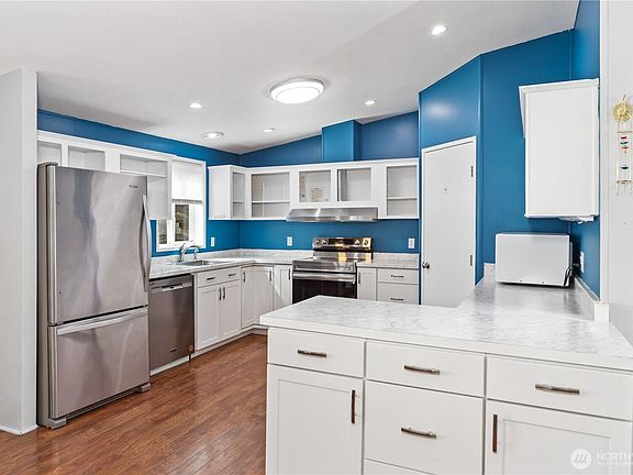 All-Age Park. Remodeled 3 bedroom plus den home in Central Kitsap School District. Features include a new kitchen with stainless appliances, a new roof, and heat pump. Split floor plan, the primary bedroom offers a walk-in closet and remodeled bath with LVP tile, roll-in shower, and soaking tub. Other side, has large Den, 2 additional bedrooms and an updated bathroom with a walk-in shower and extra storage. The home has updated recessed lighting, fans, wheelchair access via ramped entry, and 36” doors. Located on a nice corner lot with ample parking and a storage shed. Great location, it is just minutes to Silverdale.