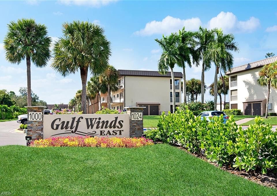 OWNER SAYS SELL! $10,500 PRICE ADJUSTMENT FOR QUICK SALE!! Welcome to Paradise at Gulf Winds East! Renovated in 2024!! Coastal Modern 2 bedroom, 2 bathroom FIRST floor 1000 sq. ft unit which touts serene lake views! This condo is a MUST SEE! Condo features all new ''soft close'' wood kitchen cabinets, GE Profile stainless steel appliances and Quartz countertops. Cortec wood style vinyl planking throughout. Beautiful bathrooms with stylish vanities. High impact windows and doors. Entire condo is newly painted. New window treatments. Rear of unit faces southwest over your private patio to enjoy your morning coffee or sunset cocktail and dinner under the tiki hut with BBQ just outside. Enjoy a swim at the resort style pool or soak in hot tub, play pickle ball, tennis or bocce ball during the day. Location is perfect as it is close to Marco Island, downtown Naples and Beaches. In addition you will have a dedicated parking space and storage unit. Listing agent has ownership interest.