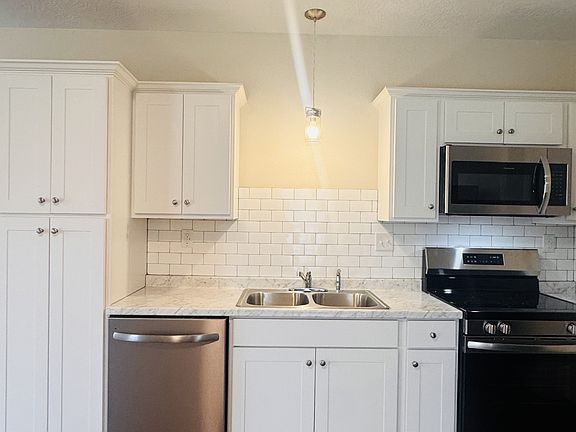- Stainless steel appliances, including a refrigerator, range, and microwave