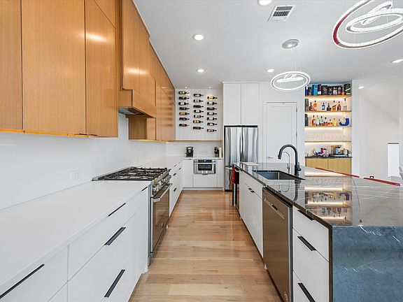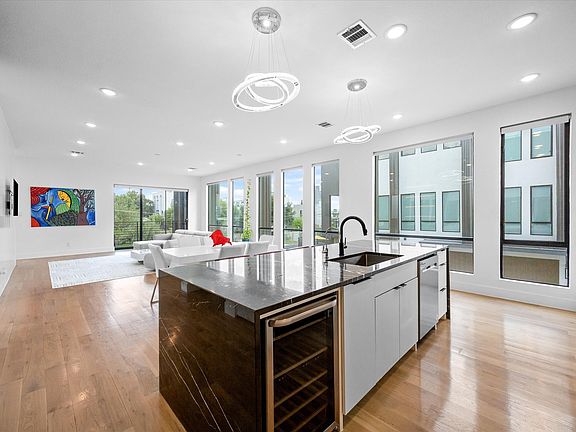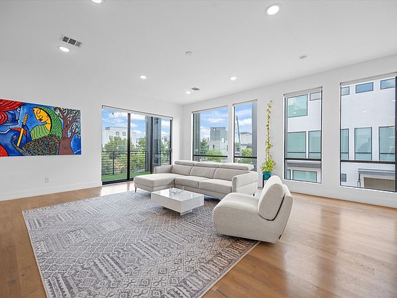 Experience elevated living just minutes from the heart of Dallas in this architecturally striking modern townhome that seamlessly blends luxury, style, and functionality. From the moment you step inside, you’ll be impressed by the refined details, thoughtful design, and exceptional outdoor amenities—including a heated private pool and an expansive rooftop terrace with panoramic views of the Dallas skyline. Designed for entertaining, the rooftop retreat features a built-in outdoor kitchen and fire pit, offering over 1,000 square feet of open-air space perfect for gatherings or relaxing above the city lights. The first floor offers a private guest suite and provides direct access to the pool courtyard, making it an ideal layout for visitors or a secluded work-from-home space. On the second level, the main living area flows effortlessly into a gourmet kitchen outfitted with a marble waterfall island, custom cabinetry, and a striking wine display wall with a built-in cooler. A reverse osmosis water system and Bertazzoni Italia 36-inch gas range elevate both function and form. Floor-to-ceiling windows bring in abundant natural light, while a balcony off the living room adds the perfect touch for indoor-outdoor living. The top floor offers ultimate privacy with a secondary ensuite bedroom and a lavish primary suite featuring a spa-style bathroom with an oversized glass shower, freestanding soaking tub, dual vanities, and a custom walk-in closet designed with organization in mind. Located less than three miles from Downtown Dallas, with convenient access to major highways, this townhome offers the perfect mix of tranquility and urban energy. Enjoy close proximity to the Bishop Arts District, Trinity River trails and an array of shopping and dining options that make this one of Dallas’s most dynamic and desirable areas. With premium craftsmanship, smart layout, and unmatched rooftop views, this home delivers the ultimate in contemporary city living!