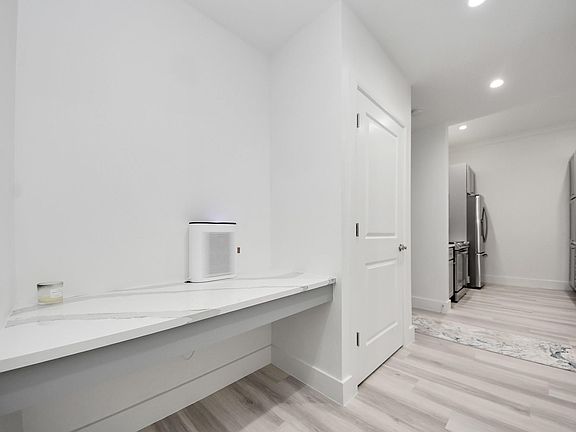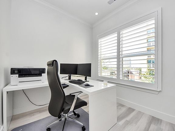 Discover refined living in this beautifully renovated 1-bedroom, 1-bath condo with a study, offering the perfect blend of comfort and sophistication. Step inside to a bright open-concept layout with fresh paint, new solid laminate floors, crown molding, quartz countertops, updated lighting, and plantation shutters throughout. The spacious living and dining area includes a wine fridge, perfect for entertaining. A versatile study or sitting area provides flexibility for a home office or guest space. The primary suite features a large walk-in closet and a newly updated bathroom with modern finishes. Additional highlights include a private study nook with desk and water softener, ample storage, and a private balcony to unwind. Ideally located near top restaurants and shops, with one dedicated parking space and one leased spot—this home offers elegant, low-maintenance living at its best.
