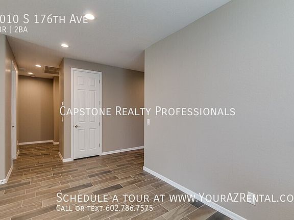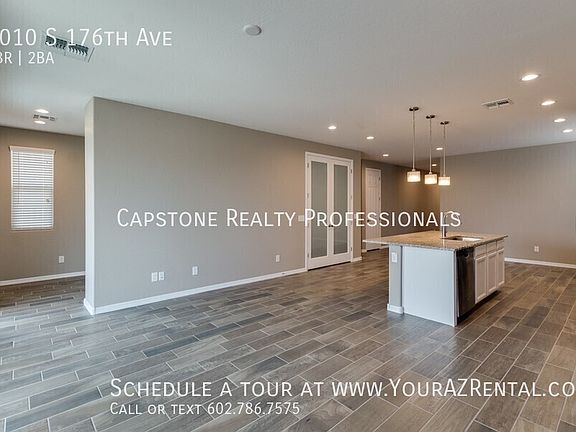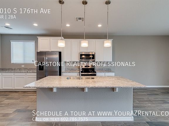 Step into a modern and inviting home nestled within the vibrant Las Brisas community in Goodyear. This stunning 3-bedroom, 2-bathroom residence offers a thoughtfully designed kitchen featuring attractive nutmeg-finished cabinets, gray tile flooring, and a spacious center island.