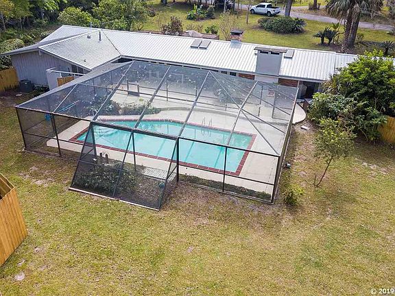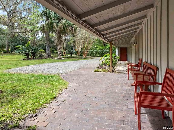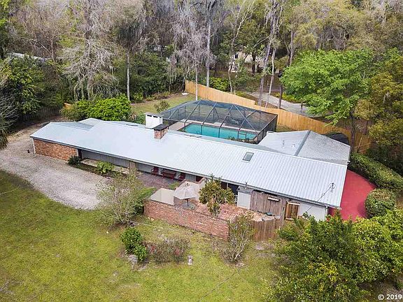 You won't want to miss this beautiful mid-century modern home nestled on just under an acre in the stunning Kirkwood neighborhood. With three bedrooms and two bathrooms across 2,285 sq. ft. of open floor space. It is within walking distance to the University of Florida, Shands and the VA hospitals and downtown Gainesville, this beautiful mature neighborhood is in the perfect central location. Large portion of home boasts of gorgeous Saltillo tile and is absolutely flooded with natural light from the floor to ceiling windows and skylights. You won't want to leave the open-concept heart of the home that offers gorgeous vaulted ceilings with beam details, two fireplaces and beautiful poolside views from almost every room. Perfect for the buyer that loves to host, this home features a giant deck off the living area just waiting for your next party. Beat the Florida heat with the gorgeous, covered in-ground pool, and while you're outside enjoy the mature landscaping and citrus trees, brand-new privacy fence, shed for extra storage and metal roof boasting extra foam insulation (Roof replaced in 2017).