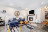 Modern gas fireplaceFlex spaceOpen concept floor planStainless steel appliancesCozy window seatBreakfast barLarge tiled glass shower