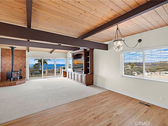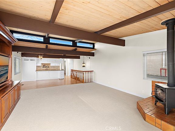 The main level features a spacious living room with open-beam ceilings, a wood-burning stove, built-ins, and a large ocean-view deck perfect for entertaining. The remodeled kitchen includes stone finishes, granite counters, stainless steel appliances, a double-door refrigerator, built-in microwave, and pantry. The adjacent dining area offers seamless flow between kitchen and living room. The upstairs bedroom includes a view balcony with yard access, cedar-lined closet, ceiling fan, and a brand-new walk-in tile shower with designer stone.