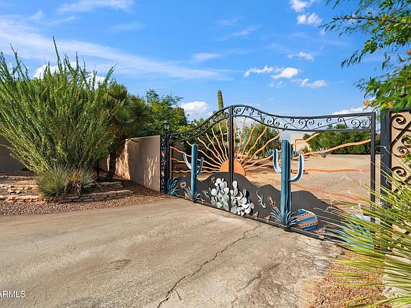 A hidden gem in Desert Hills. Landscaped yard opens to a courtyard inviting you into this 3bd 2bth home. Home office with built ins, detached workshop & horse corrals. This home has been well cared for and it shows! Custom tile work, doors and extras bring added luxury throughout! The backyard is ready for quiet nights or entertaining with large wood burning fireplace, seating & fountain. Custom dbl gates give access to the roomy area in back from Egret St or Joy Ranch Rd. Easy to park, turn around or drive through. 30x40 Detached Garage/Workshop with 220 elec & water. Attached to workshop is 24x40 covered patio area used for covered horse corrals with side turnout area. Fruit trees, rose bushes & natural vegetation on the property have an irrigation system. Short ride/walk to state lan