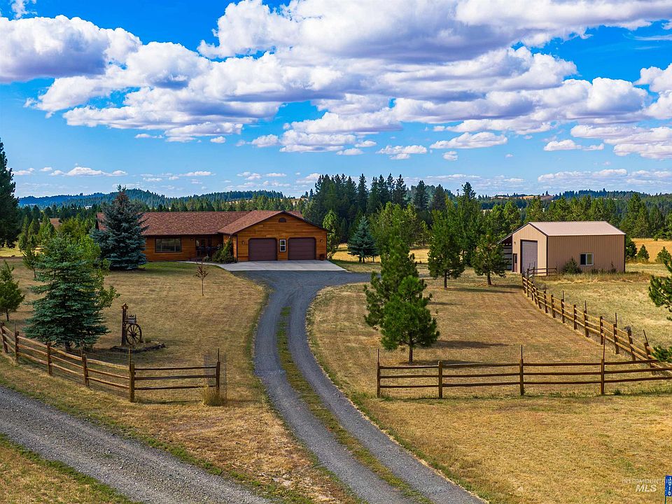 Priced to sell! This well-designed ranch home offers easy single-level living on a magnificent 10-acre parcel in beautiful Deary, ID. The thoughtfully designed 1804 sqft floor plan features 3 bedrooms and 2 bathrooms, including a spacious primary bedroom & bath. The kitchen boasts abundant cabinetry with granite countertops, while expansive windows throughout create bright spaces that beautifully frame the surrounding landscape. The property's outdoor amenities truly set it apart, featuring a large covered deck perfect for entertaining, large landscaped yard with established flowerbeds, and mature fruit trees incl. plum, apple, and cherry varieties. Add'l features include an expansive 31'x31' garage with an extra room ideal for storage or office space, a 24'x30' shop with electricity and concrete floors, and a 30'x12.5' lean-to, plus a 10'x12' storage shed. The partially fenced, flat usable land provides endless possibilities for outdoor activities and peaceful country living while close to services.