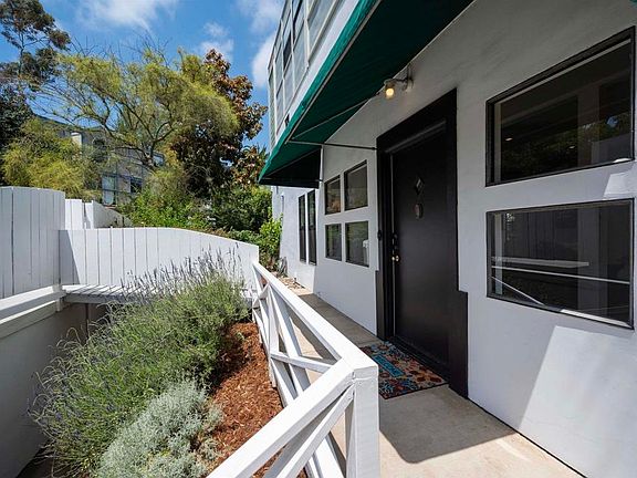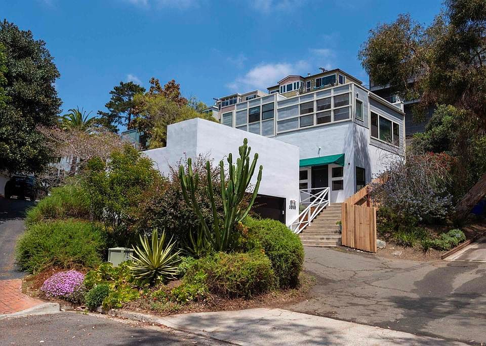 Welcome to 1010 W. Upas Street! A one-of-a-kind custom-built home designed by Ted Smith and associate, Kathy McCormick, tucked away in the Spruce Canyon neighborhood of Middletown. Built in 1984 when open plan was the norm in “commercial architecture”, Ted Smith’s idea was to adopt this concept for a residential home. It was considered “unconventional” and was featured in Architectural Record and pictured on the cover of New West Magazine. This 2 bedroom, 2.5 bath home offers 1,982 square feet of living space, high ceilings, a tremendous open floorplan downstairs, an abundance of kitchen cabinets and counter space, two sets of French doors that lead to the backyard, wood burning fireplace, half-bath for your guests, beamed ceilings & slate flooring throughout the downstairs area. Fresh air and natural sunlight make its way through the abundance of windows on each floor level. As you make your way upstairs, you’ll appreciate the beautiful hardwood flooring that continues throughout the top floors. The split-level floor plan features two bedrooms, each with their own en-suite bathroom. The first bedroom is light and bright with beautiful French doors that lead into the bathroom. Just outside this room, you’re greeted by a small spiral staircase that takes you into the spacious open loft area. This room presents itself as an oversized primary bedroom with a relaxing sitting space that is perfect for reading. You’ll also enjoy the private en-suite bathroom as well. This top floor has a multitude of uses and has the feel of being in a tree house surrounded by nature. Almost an entire wall has built-in cabinetry, desk area, shelving and drawers that go from floor to ceiling. This area also has the potential to be made into two separate rooms if one chooses. The possibilities are endless, catering to various lifestyles. Outside, lush landscaping, tiled patio and cleared pathways wrap around the home. You’ll also find rooftop access with the potential for more outdoor space just over the 2-car detached garage. A perfect spot to sunbathe, read, entertain friends, or just hang out and relax. Sellers also have architectural design plans for an addition over the garage. This Spruce Canyon location is a short distance to Downtown, Little Italy, the famous El Indio Restaurant and Aero Club, less than a mile to the Airport, and all the shopping that south Mission Hills has to offer.