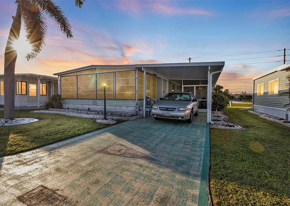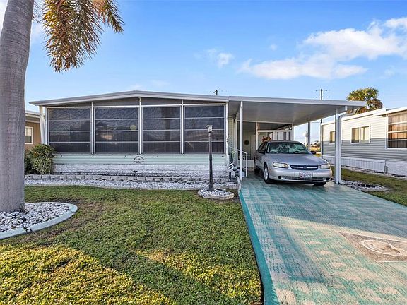 BRAND NEW ROOF! Spacious 2 bed/2 bath mobile home in popular River Haven Community a 55+ across the street from the Burnt Store Publix shopping center including Home Depot, Publix, Pet Superstore, Shipping Store and so much more! VERY CONVENIENT TO ALL AMENITIES including Walmart and just minutes to the 1-75 exit so you can get where you need to go quickly. This home features one of the largest primary suites I've seen with spacious built in closets and a large master bathroom. FURNITURE INCLUDED, ALL APPLIANCES INCLUDED. 2 full beds and 2 full baths. ESCAPE TO YOUR OWN WINTER RETREAT WITH THIS AFFORDABLE HOME! Large outside screened lanai with 1 - car carport and storage shed + additional FLORIDA ROOM AT FRONT OF THE HOME! THE LAUNDRY ROOM IS INSIDE FOR YOUR CONVENIENCE. River Haven is one of the prettiest parks in the area AND HAD NO FLOODING DURING ANY OF THE STORMS. The community offers their residents a host of amenities including a HEATED AND CAGED COMMUNITY POOL, clubhouse, marina with docks, park area, shuffleboard courts, and a boat storage area. Just a short drive from Historic Downtown Punta Gorda, where there are weekly farmer's markets, fine and casual dining including waterfront dining, miles of biking paths and FISHERMEN'S VILLAGE WATERFRONT MALL! There are many social events to keep you as engaged as you'd like to be. LOW HOA FEE IS ONLY $250/MO AND INCLUDES LAWN MOWING, WATER & SEWER! With low fees and a welcoming community atmosphere, now is the perfect time to secure your winter retreat! Buyer must be interviewed and approved by the Board. Land is resident-owned and requires a 10-share purchase for $10,000 WHICH IS REFUNDABLE WHEN YOU SELL. Call today for a private showing and community tour!