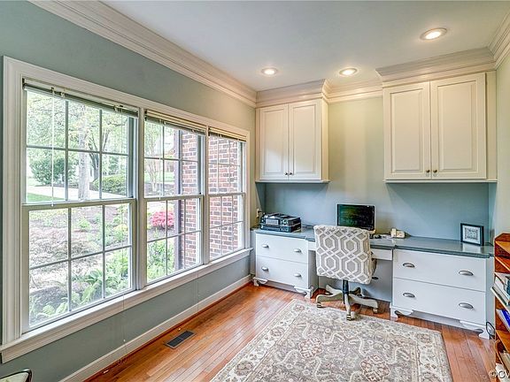 Beautiful and well maintained 5 bdrm and 5.5 bth home located on an almost 1 acre private cul-de-sac lot. Entering the home you will notice the 2 story foyer. The 1st flr has HW floors, 9'+ ceilings, crown moldings and an open floor plan. Dining room has trey ceiling and bay window. Kitchen is eat-in with granite countertops, deep pantry, island and access to deck with awesome view of private back yard and is open to family room with gas fp. Home gets great light! Office space is off of foyer w/built in cabinetry. Spacious primary is on 2nd level with tons of closet space, sitting area and ensuite bath. 3 other nice size bedrooms (1 with full ensuite bath), hall bath and laundry room complete this level. 3rd level of home is a bonus with office/sitting area with skylights, bedroom #5 and full bath...great guest space/teen space. The lower level boasts fantastic rec room with kitchenette. Pool table & projection tv convey. Lower level is walk out to the backyard and has wood burning fp. Workshop on this level too! Exterior is low maintenance with brick & vinyl siding, gutter guards and full irrigation system. Home is block away from community center & pool.