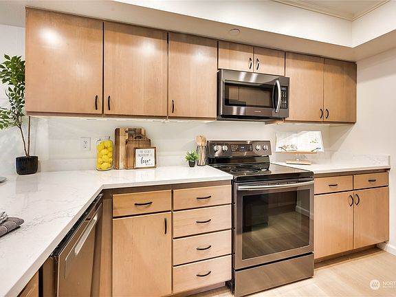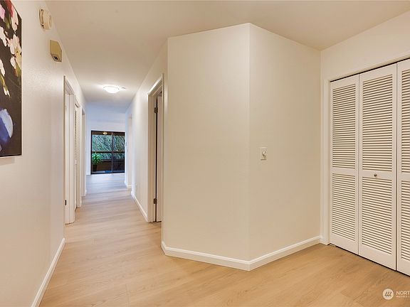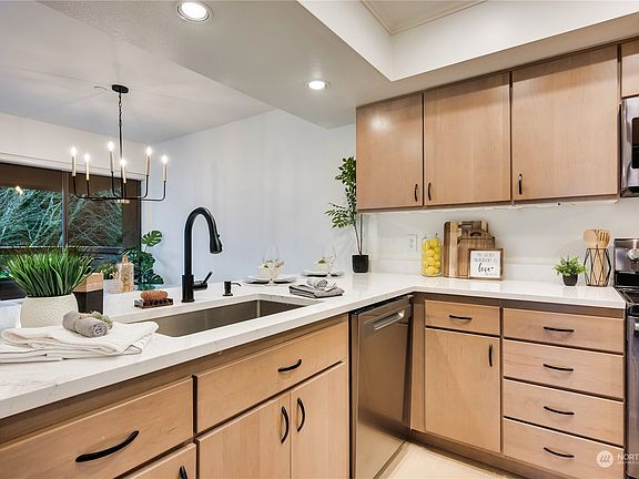 This beautifully updated northwest corner condo in Downtown Bellevue offers peaceful nature views of Wildwood Park and embodies the best of urban living. This two bedroom & two bath condo features an open layout & is ideal for entertaining, with natural light flowing throughout the space. Relax outdoors on the private balcony or unwind inside by the cozy gas fireplace. The kitchen features new quartz countertops, sink and faucet. The home boasts new wide-plank waterproof laminate flooring, fresh paint, updated lighting and a brand-new water heater. Custom closet systems are installed in each bedroom providing ample storage. The unit includes secured underground parking & a storage room. Just steps away from shopping, dining, cafes, & more!