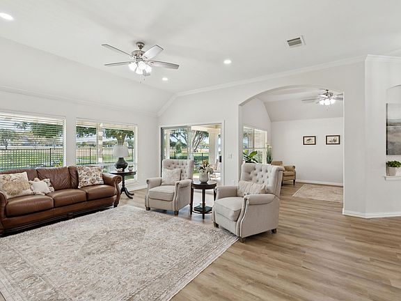 The foyer opens to a spacious living room with a wall of windows showcasing sweeping views of the golf course and pond. A sliding glass door leads to the covered patio and pergola, creating a perfect space for relaxing outdoor living. A flexible room just off the living area is ideal for a second living room, study, or hobby space.