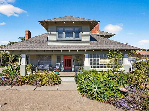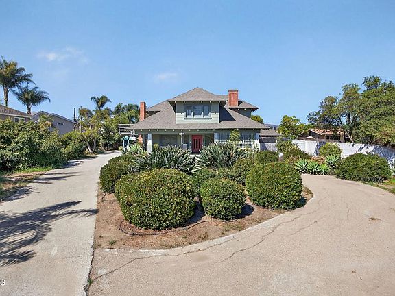 One of a Kind! This Charming 1912 Craftsman, offering 5 bedrooms 2 full and 2 half baths, 3487 sq ft of living space with a circular driveway, 3/car garage and extra work/craft room on a spacious 26,572 sq ft lot. Nestled behind a private gate this exceptional home combines classic character with generous living spaces.Inside you will find elegant custom crown molding, wainscoting, and wood beamed ceiling that highlight the homes craftsmanship. Many original doors and windows with beveled and stained glass. The open concept living and dining areas flow seamlessly complemented by built-in cabinetry with beautiful original wood details. Separate quest quarters, a beautiful glass block sunroom with tin ceiling and separate entrance from one of the covered porches.The beautifully remodeled kitchen has an eating area, and lots of pantry storage. Upstairs 3 spacious bedrooms, one with a balcony, offers comfort and flexibility for family, guests or home office needs. There is an assortment of fruit trees (including delicious avocados) and vegetation in the front and backyard. There may also be the potential for adding an ADU. This property provides a rare blend of privacy, space and timeless design, ideal for anyone seeking a classic Ventura residence with room to grow!