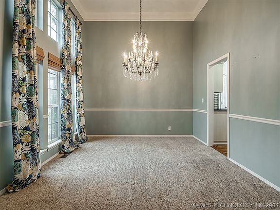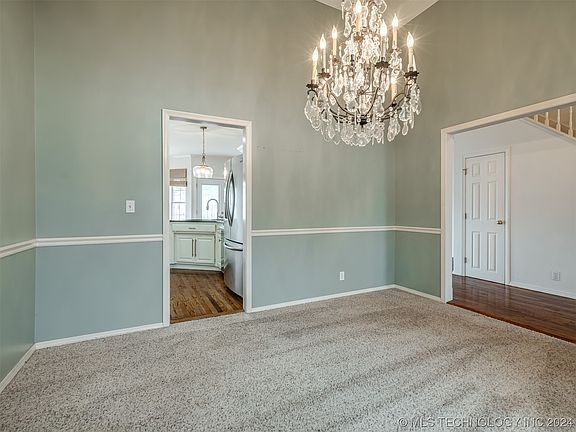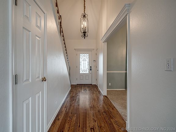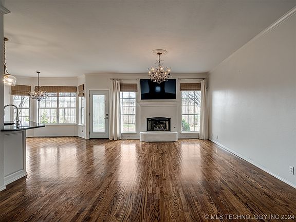 Charming brick & stone home located in the desirable Delaware Pointe community, just blocks from Jenks Middle School. Open floor plan offers 2,854 SF with 4 beds (master suite downstairs) and 2 full and 1 half baths. Updated kitchen with granite countertops, glass tile backsplash, abundant cabinetry & breakfast nook. Elegant, soaring ceilings in formal dining and stunning hardwoods throughout the entry, living, kitchen and hallways. Spacious master suite includes study niche, walk-in closet with built-ins, walk-in shower & whirlpool tub. Updated powder bath downstairs. Upstairs are 3 additional bedrooms, a hall bath & a large game room with built-in desk and cabinetry. Freshly painted on the exterior and nestled on a cul-de-sac lot, this home features a fenced yard, extended back patio perfect for unwinding, wrap-around sidewalk and beautiful landscaping. Washer, dryer, refrigerator and shed remain. Jenks Southeast Schools.