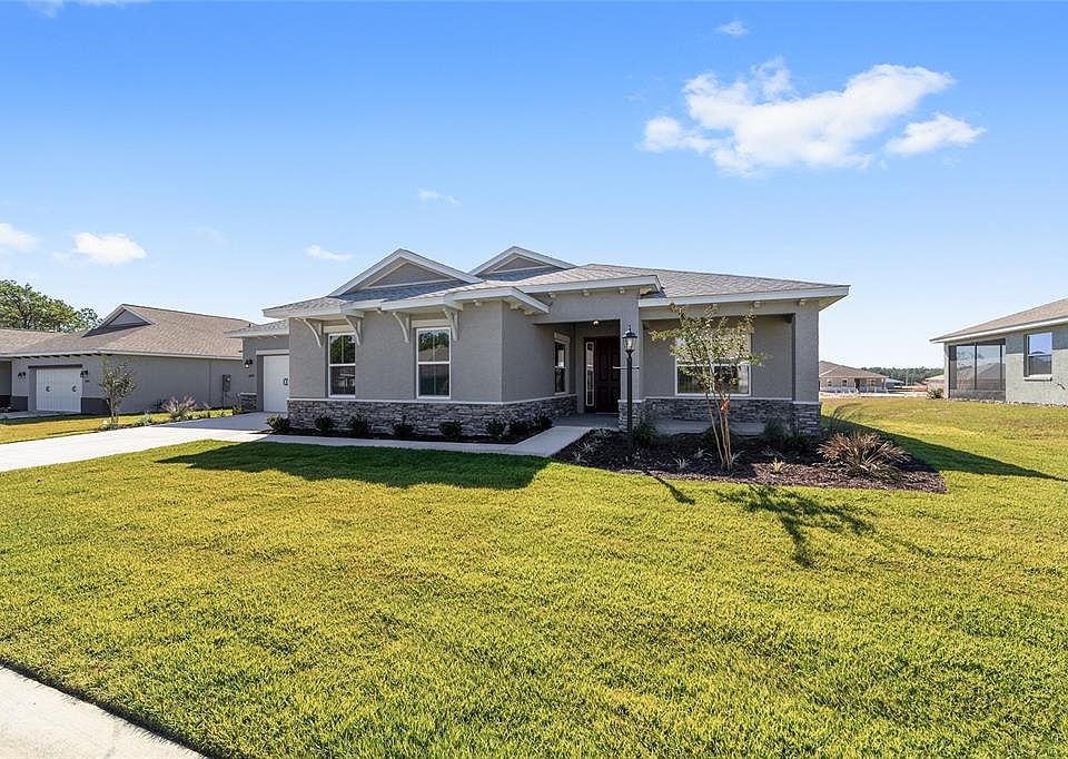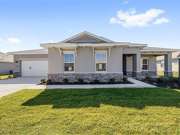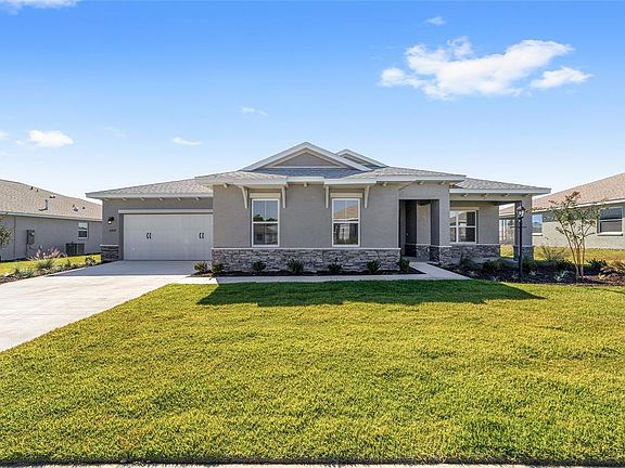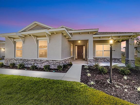 Stunning Magnolia model located in the desirable LongLeaf Ridge neighborhood of On Top of the World. This 2-bedroom, 2.5-bath home with a 2-car garage plus a golf cart garage offers over 2,400 sq. ft. of thoughtfully designed living space. The bright, open floorplan features tile flooring throughout and a flex room with French doors at the entry—perfect for a home office, hobby space, or guest room. The living area features a 4-panel sliding glass door that seamlessly connects to the screened lanai, while the dining area is highlighted by four floor-to-ceiling windows overlooking the backyard, creating a light-filled and inviting space. The chef-inspired kitchen includes staggered cabinets with crown molding, a cooktop with range hood, built-in microwave and oven, stainless steel appliances, a large L-shaped island with quartz countertops, under-cabinet lighting, and a spacious walk-in pantry. The split bedroom layout provides privacy, with the primary suite featuring a walk-in closet and a luxurious en suite with a double vanity with quartz countertops and a zero-entry tiled walk-in shower with a built-in bench. The guest bedroom offers a generous closet and its own en suite with a single quartz vanity and a tiled tub/shower combination. Located in a premier 55+ community, LongLeaf Ridge offers resort-style amenities including a clubhouse, fitness center, pools, golf, and a variety of social and recreational activities—perfect for an active, vibrant lifestyle.