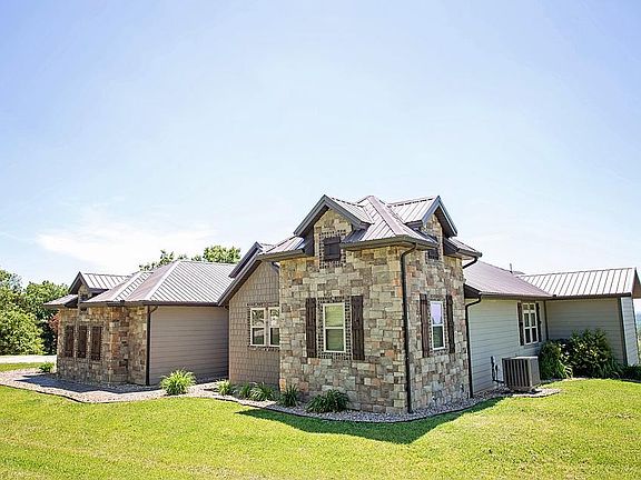 Custom Built Home with Old World Style and spectacular Ozark views for miles! Home built in 2013 offers 5 bedrooms, 3 bathrooms with an open floor plan. The spacious 22x23 living area with exposed beams and custom stone fireplace is open to the kitchen with antiqued cabinets and stone backsplash with an island/bar and large dining area. The master suite, 2 more bedrooms and laundry complete the main floor. The lower level offers a 23x23 family room with wet bar, 2 additional bedrooms, media room and playroom/office area. You can't find views like this property offers from the upper screened-in porch off the great room or the downstairs covered patio/deck. There is also an attached garage and John Deere Room for equipment storage. Property offers privacy yet still close to town. This well built home is a must see if you are looking for a quality home with style and space.