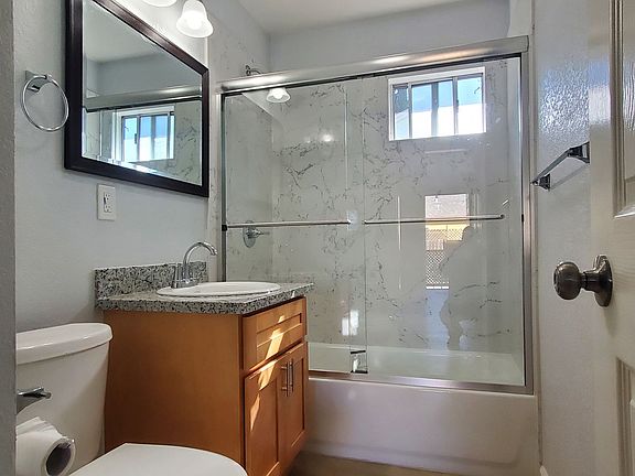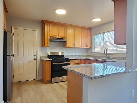 100% Remodeled single story duplex with 2 bedrooms, 1 bathroom, and a 1 car private garage. The spacious home has a large front yard and has been completely renovated with a brand new kitchen, new appliances, wood laminate flooring, fresh paint, and remodeled bathroom. The kitchen includes wood cabinets with granite counters, a separate breakfast bar, fridge, dishwasher, and gas stove. The bathroom includes a new tub with shower and enclosure and a new vanity. Additional amenities include a washer and dryer provided inside the garage and a large back patio.