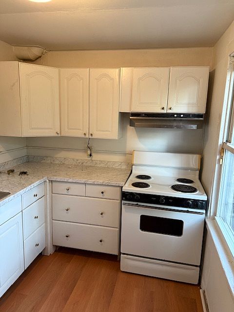 **Bright kitchen with appliances - stove, oven, side-by-side fridge