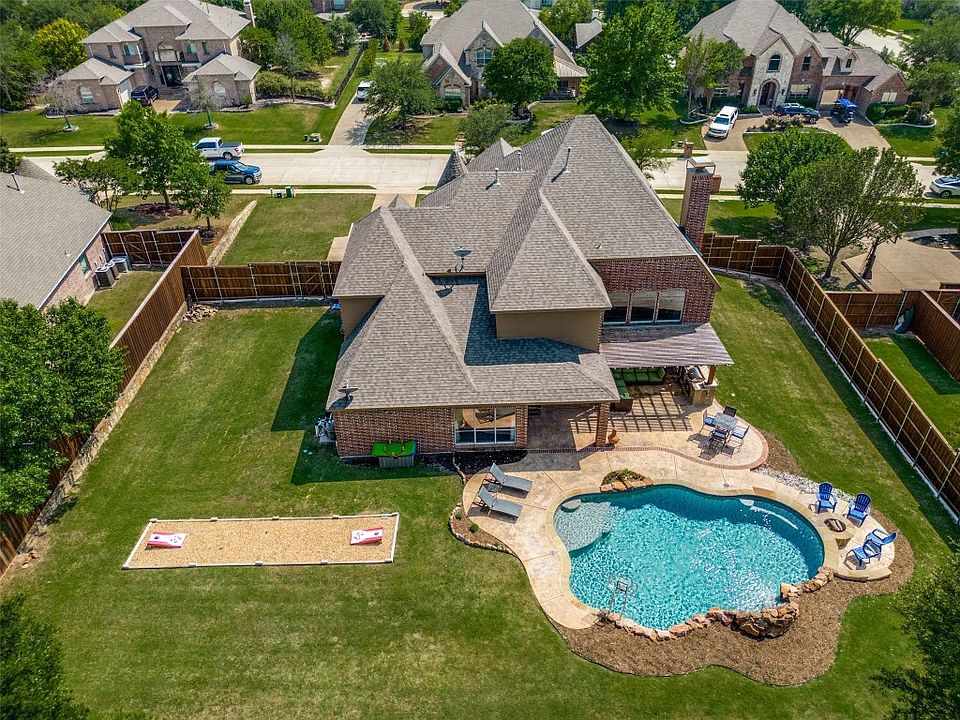 WOW! This Toll Brothers home truly has it all and is situated on nearly ONE HALF ACRE in one of Prosper's premier neighborhoods! Gorgeous Solid Hardwood floors, a kitchen fit for the pickiest chef with ample storage, granite counters, center island, HUGE eat in area, and a view of the BACKYARD OASIS. Soaring 20 ft ceilings in Family Room with floor to ceiling stone fireplace. Primary bedroom with view of the enormous back yard and pool. Bath features jetted tub, large shower, and his and hers closets. Second bedroom downstairs perfect for guests. EVERY bedroom has direct access to a bath. Two LARGE beds, Game, and Media upstairs! Outdoor living perfect for relaxing and BBQs! Beautiful pool and a yard to die for! If you have been looking for a gorgeous home with a pool plus large yard in an award winning school district, this is IT! New Carpet, Paint, Landscaping, 31 windows new glass, all in 2023! Custom finishes such as heavy moldings, high end cabinets, and solid core doors!