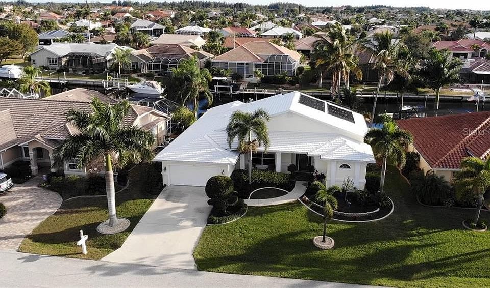 **PRICE REDUCED** - PLEASE ENJOY THIS LISTING's 3D INTERACTIVE VIRTUAL TOUR. Paradise found! Welcome home to the waterfront community of Punta Gorda Isles! Located in the heart of the isles is where you'll find this well-maintained 3-bedroom, 2-full bath Florida ranch-style pool home. With just over 2240 Sq. feet of air-conditioned living space, this light & bright gem offers both a family room and living room, as well as a split bedroom plan for added privacy. The spacious kitchen, complete with a dinette area, stainless appliances, and stone counters, overlooks the South facing screened pool enclosure. This inspiring waterfront space, measuring over 1000 Sq. feet in size, includes a heated pool, 250 feet of under-roof lounging space, and a full array of outdoor grilling equipment. This area is accessible from the living and family rooms, as well as the kitchen and master suite. The 77 feet of city-maintained (new) seawall is fitted with a concrete dock with new pilings, a 10,000-pound lift and water and electrical services. From this dock, you have QUICK powerboat access to Charlotte Harbor and the Gulf of Mexico beyond. The carpeted master suite enjoys dual walk-in closets and a bath with a separate shower and garden tub. Other features: flooring which consists of 20" ceramic tiles and new carpeting in the 3 bedrooms and family room, volume ceilings, a whole-house water softener, window storm protection and, a spacious 2 car attached garage with ample storage and newly finished flooring.