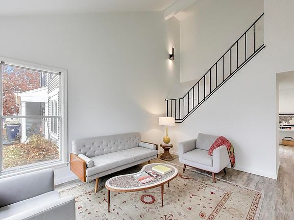 Wood-burning fireplaceModern updatesCozy sitting areaFresh paintNew recessed lightingCathedral ceilingsLarge dining area