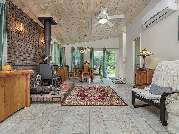 This turnkey property is 930 sq. ft., 2 Bedrooms, 1 ½ Baths, 2.24 acres and 160 ft. of lake frontage. The Home is almost all renovated: bathrooms, kitchen, stainless-steel appliances, electric, plumbing, living room, dining area and bedroom. New heating and cooling system, a Hyper Heat Pump and 4 mini splits with separate controls in each room. New stacked washer and dryer, new wood ceiling, new floors and professionally insulated. Windows throughout with a spectacular, panoramic view in a bedroom. Great tasting well water and a 750 Gal. cement septic tank. Wood burning stove on a brick hearth, access to the deck and patio. Lake Harwood is known for its swimming, boating and fishing. It is an all-sport lake, spring fed, and it has an active lake association. The land is part wooded with a large flat grassy area near its 160 ft. of lake frontage. Stairs and a gravel path lead the way to the house above in another flat area that overlooks the woods and lake. The property has room for expansion and it is near restaurants, Corey Lake Marina and the Swiss Valley Ski Resort. It is just 2 hours from Chicago and within minutes of quaint, towns and shopping. This is a gem for the price!