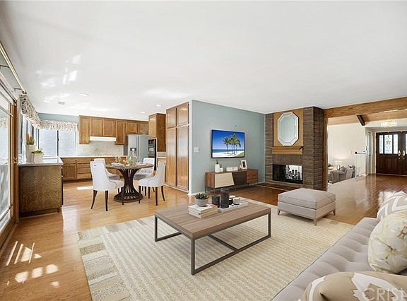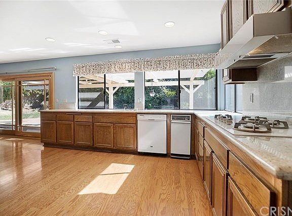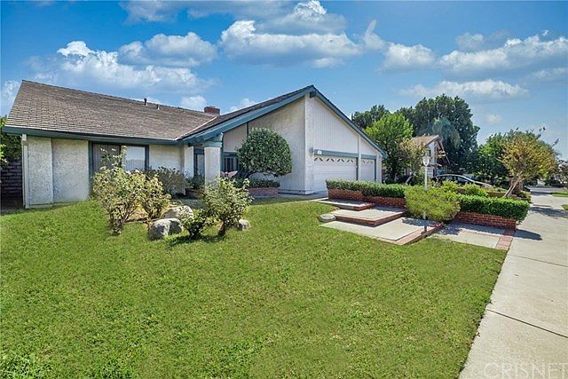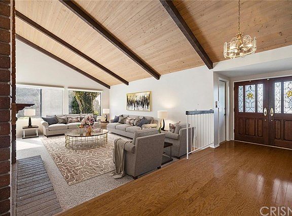 Central Chatsworth home with curb appeal! Three-car garage! 3 BR's, DEN with wet bar, and FR make this 2417 sq. ft. open floor plan ideal for entertaining - as well as the private backyard that includes pool, spa, firepit, and a large covered patio with 2 decorative porticos! The Front Entry has double doors with beautiful stained glass windows and gorgeous hardwood flooring! There is also hardwood flooring throughout the Family Room and Kitchen. The spacious step-down Living Room has a vaulted wood beam ceiling. A double-sided brick fireplace is open to the Living Room and Family Room, and there is a custom framed mirror over the mantle in each room - very dramatic! The step-up Formal Dining Room has a mirrored wall and leads to the Kitchen. There is an abundance of cabinet and pantry space and granite counter tops in the kitchen, plus eating space, recessed lighting, a pass-thru window, and other large windows that overlook the patio, pool, and private backyard. The Family Room is open to the Kitchen and Entry and affords views of the backyard. Sliding glass doors open to the patio from the Family Room and the Master Bedroom. The Master Bedroom also has decorative stained glass windows, a ceiling fan-light, a walk-in closet, and a private bath with double sinks and enclosed shower stall. There are smooth ceilings in most rooms. This home is located near shopping and all amenities in Porter Ranch, Northridge, and Chatsworth!! A lovely home that's been well-cared for!!