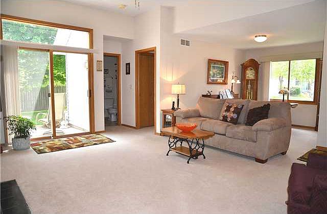 NO STEP LIVING!!! Top notch condition. Very open plan with lots of light! And, a view! This twin-home townhome is the closest to a single family home that you can get! 22' deep garage with built-in shelving. Great closets for storage. Sliders lead to a very private patio. MBR is big enough for a pier system bedroom set! MBA has dual sink vanity and walk-in shower. Fully equipped kitchen plus a double door pantry. Low dues! Don't miss this one!