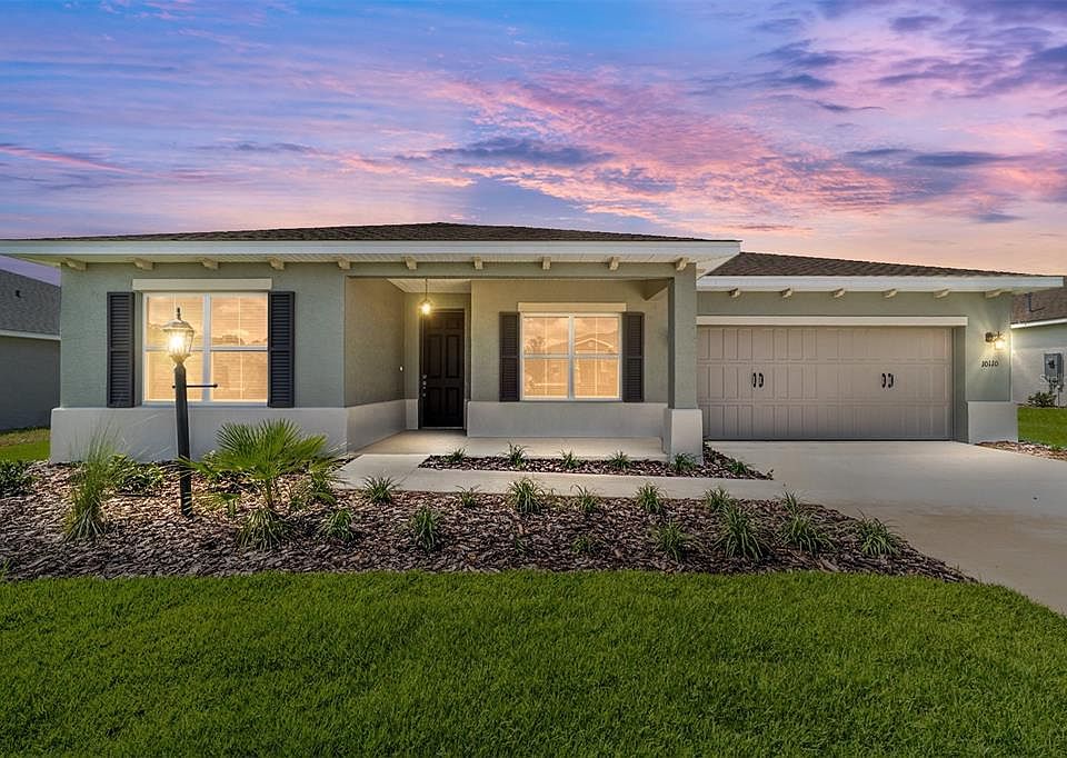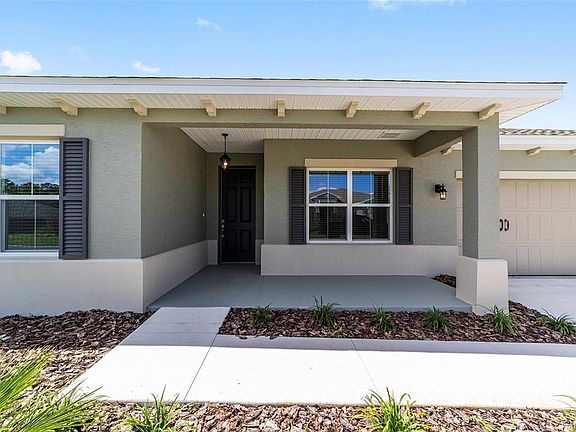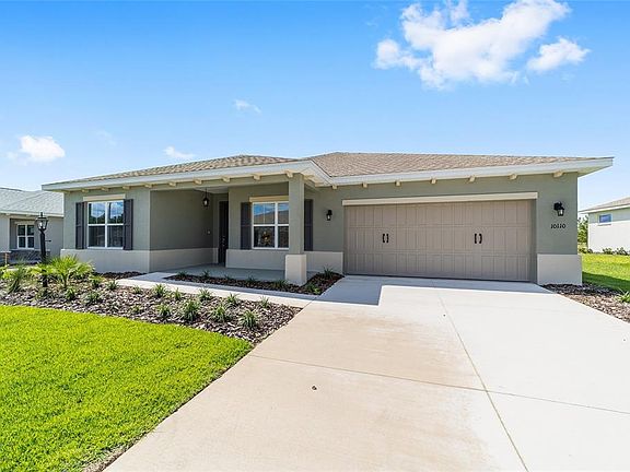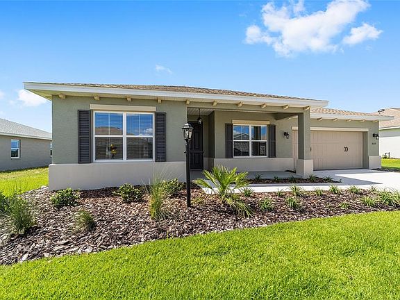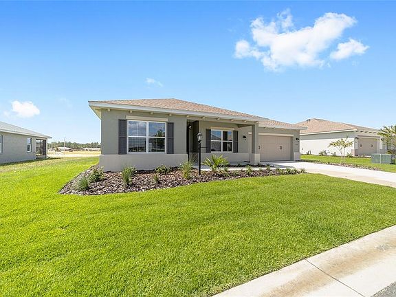 Discover the Ariana Model, a stunning new construction home in LongLeaf Ridge at On Top of the World, Ocala’s premier 55+ active adult community. Thoughtfully designed for both style and comfort, this home offers 2 bedrooms, 2 bathrooms, a versatile flex room, luxury vinyl plank flooring, and a spacious 2+ car garage. The gourmet kitchen is a showstopper, featuring a built-in oven and microwave, 5-burner cooktop, quartz countertops, elegant backsplash, and under-cabinet lighting. Premium white staggered cabinetry with crown molding elevates the space while providing ample storage, complemented by a walk-in pantry and an oversized island—perfect for both entertaining and everyday living. At the front of the home, the flex room with French doors makes an ideal office or hobby space. The guest bedroom enjoys abundant natural light and a large closet, with an adjacent full bath featuring a quartz vanity and a tile shower/tub combination. The primary suite is a private retreat with a large three-panel window, generous walk-in closet, and spa-inspired en suite complete with a double vanity sink with quartz counters, a zero-entry tiled shower with built-in bench and glass enclosure, and a linen closet. Step outside to the screened lanai, where you can enjoy Florida living year-round. Nestled in a gated, golf cart-friendly community with world-class amenities and direct access to shopping and dining, this home perfectly balances luxury and convenience. Don’t miss your chance to own this elegantly finished, move-in ready home—schedule your private showing today!