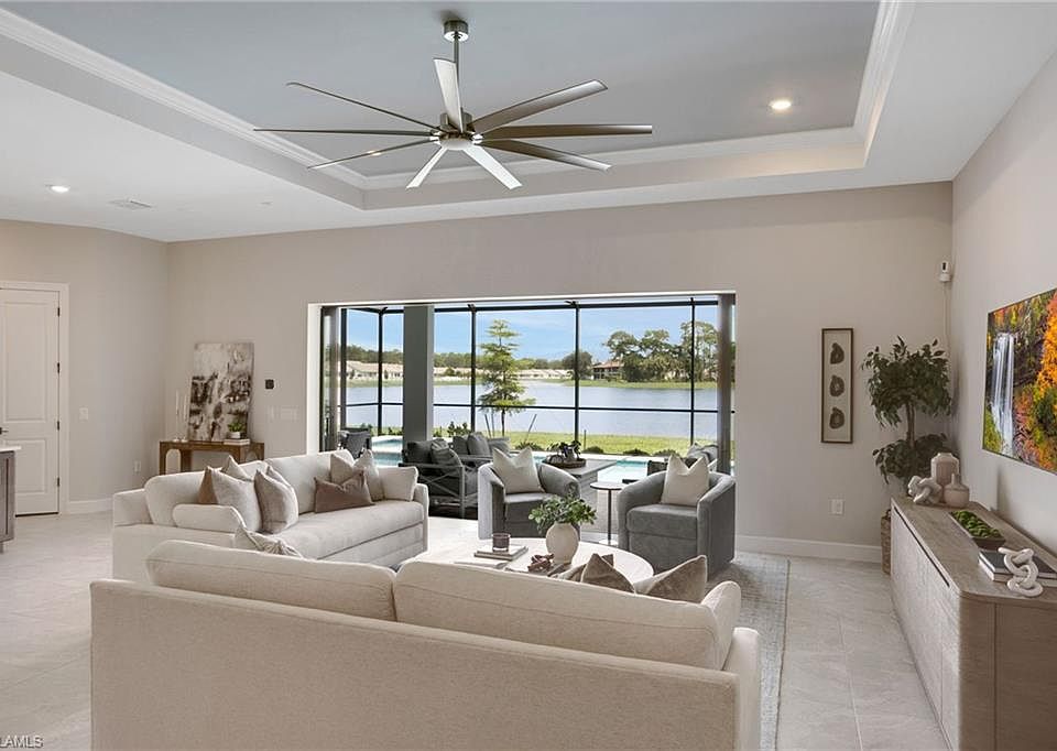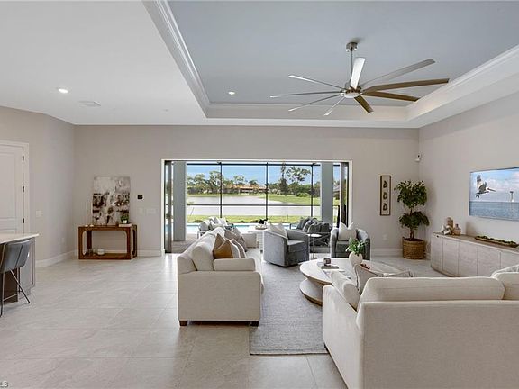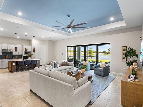 The stunning residence at 10112 Seaside Way is a beautifully appointed sanctuary, move-in ready 3 bedroom +den, and negotiable for turnkey. Professionally curated with designer-selected luxury upgrades, this new home is designed to impress the most discerning buyer. Perfectly situated on a premium waterfront lot, expansive pocket sliders frame tranquil water views and create a seamless connection between indoor living and outdoor paradise while not located in a flood zone. Inside, the home offers spaces for both relaxation and celebration. An extraordinary formal dining room sets the stage for large memorable gatherings and elegant entertaining, flowing into a comfortable living room accented by tray ceilings for an elevated touch. The chef’s kitchen delights with gas appliances, a striking custom tile backsplash, 42” soft-close cabinetry with crown molding, roll-out trays, a generous walk-in pantry, and a casual breakfast area—inviting the joy of everyday living. The owner’s suite is a private retreat, featuring a spa-inspired shower and an expansive dual-entry walk-in closet, while on the opposite side of the home, guest accommodations provide privacy with their own ensuite bath. Additional highlights include impact-resistant windows and doors, energy-efficient tankless water heaters, a three-car garage with epoxy flooring, a Lennox central HVAC with fresh air ventilator, and a Wi-Fi-enabled programmable thermostat—offering modern convenience and peace of mind. Beyond the home, discover the best of Southwest Florida living. Ideally located just minutes from award-winning beaches, RSW International Airport, and downtown Bonita Springs, residents enjoy vibrant dining, shopping, and entertainment alongside attractions rich in Old Florida charm. Spend the day kayaking or paddle boarding the Imperial River, explore the lively food truck park, enjoy live music from national and local artists at the Sugar Shack, or unwind at Riverside Park events. Even four-legged friends have their own place at the Bonita Springs Dog Park. This residence offers a rare opportunity to embrace paradise now—combining refined finishes, peaceful surroundings, and vacation style living without the wait of new construction and offers an optional furnished package.