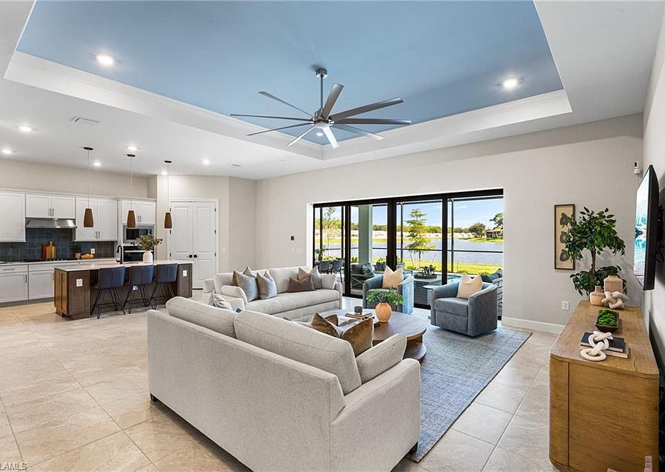 The stunning residence at 10112 Seaside Way is a beautifully appointed sanctuary, move-in ready 3 bedroom +den, and negotiable for turnkey. Professionally curated with designer-selected luxury upgrades, this new home is designed to impress the most discerning buyer. Perfectly situated on a premium waterfront lot, expansive pocket sliders frame tranquil water views and create a seamless connection between indoor living and outdoor paradise while not located in a flood zone. Inside, the home offers spaces for both relaxation and celebration. An extraordinary formal dining room sets the stage for large memorable gatherings and elegant entertaining, flowing into a comfortable living room accented by tray ceilings for an elevated touch. The chef’s kitchen delights with gas appliances, a striking custom tile backsplash, 42” soft-close cabinetry with crown molding, roll-out trays, a generous walk-in pantry, and a casual breakfast area—inviting the joy of everyday living. The owner’s suite is a private retreat, featuring a spa-inspired shower and an expansive dual-entry walk-in closet, while on the opposite side of the home, guest accommodations provide privacy with their own ensuite bath. Additional highlights include impact-resistant windows and doors, energy-efficient tankless water heaters, a three-car garage with epoxy flooring, a Lennox central HVAC with fresh air ventilator, and a Wi-Fi-enabled programmable thermostat—offering modern convenience and peace of mind. Beyond the home, discover the best of Southwest Florida living. Ideally located just minutes from award-winning beaches, RSW International Airport, and downtown Bonita Springs, residents enjoy vibrant dining, shopping, and entertainment alongside attractions rich in Old Florida charm. Spend the day kayaking or paddle boarding the Imperial River, explore the lively food truck park, enjoy live music from national and local artists at the Sugar Shack, or unwind at Riverside Park events. Even four-legged friends have their own place at the Bonita Springs Dog Park. This residence offers a rare opportunity to embrace paradise now—combining refined finishes, peaceful surroundings, and vacation style living without the wait of new construction.