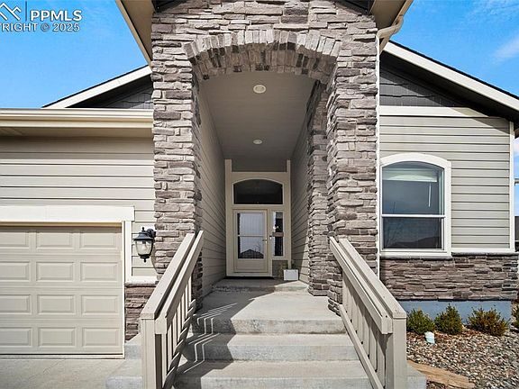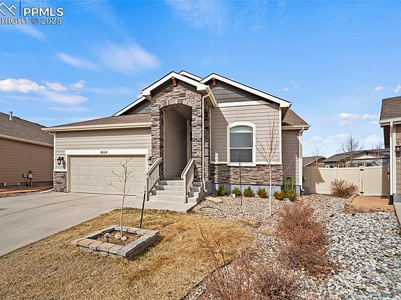 Welcome home to this stunning ranch in the heart of the exclusive Stonebridge community in Meridian Ranch—where comfort, connection, and Colorado beauty come together. This 4-bedroom, 3-bath rancher features rich wood floors throughout the entryway, living space, dining area, and kitchen, with vaulted ceilings in the great room. The gourmet kitchen is the heart of the home, complete with ample granite countertop space, espresso cabinetry with 42" upper cabinets, and upgraded GE appliances, including a double oven—perfect for entertaining. The master suite is a true retreat, offering breathtaking mountain views, a spacious walk-in closet, and a spa-like bath complete with a double-sided fireplace to enjoy from both the soaking tub and bedroom. The finished basement provides an oversized secondary living space with soaring 9-foot ceilings, a spacious rec room with a rough-in for a wet bar, two additional bedrooms, a full bath, and plenty of storage. Situated on nearly a quarter acre complete with a privacy fence and level yard space with sprinkler system, this home is perfect for backyard gatherings, playtime, and enjoying the Colorado sunshine. Steps away from top-rated schools, the Antler Creek Golf Course, scenic parks and trails, as well as the Meridian Ranch Rec Center and Lodge at Stonebridge, this is more than just a house. It's a place to call home.