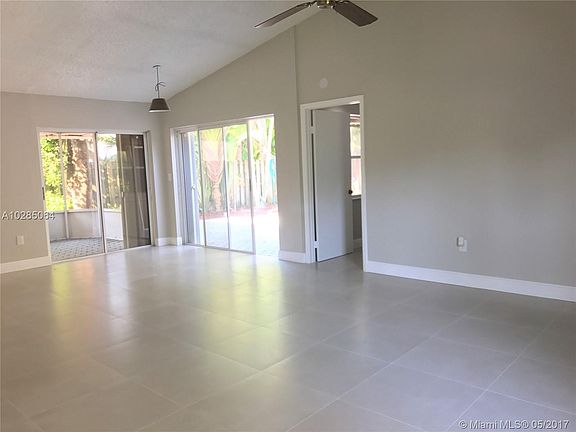Rarely available one story single family house in centrally located community of Amaretto! Completely refurbished with new kitchen, bathrooms, floors, and roof. Enjoy the privacy of your own private screened-in patio and fenced backyard surrounded by lush palm trees. Close to 2 major expressways, shopping centers, Publix, restaurants, MDCC, A rated schools, community pool, tennis court, clubhouse, & 24 hour security