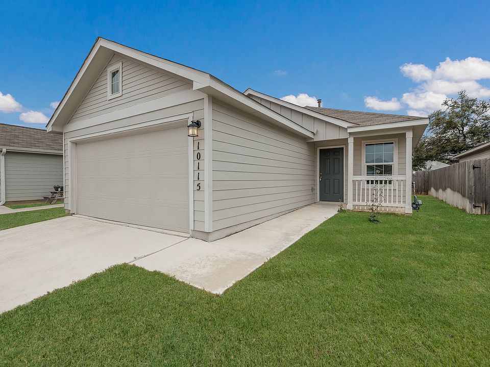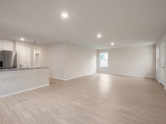 Light and bright throughout, this single-story home features an open kitchen overlooking the dining area, highlighted by granite countertops, gas cooking, and stainless steel appliances. The primary suite is privately set at the rear corner and offers a spacious bath and a large walk-in closet. A convenient hallway laundry closet fits a full-size washer and dryer.