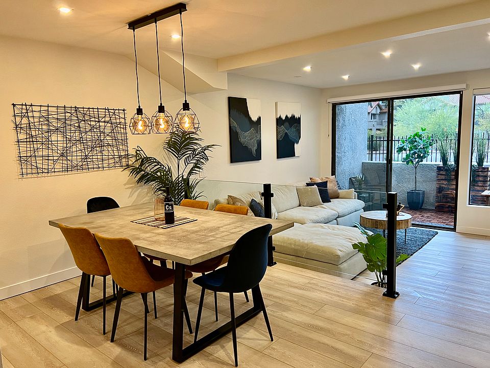 A very Inviting modern furnished home in desirable Scottsdale ranch welcomes you! This newly remodeled 2 bedroom (king&queen) 2.5 bath townhome resides in a gated community, sleeps 4, offers a 1 car garage & features quartz countertops, new stainless appliances, 85in. Samsung smart TV, an office, vaulted ceilings, large bedrooms w/ walk-in closets, motorized blinds, in-unit full size LG washer/dryer & hi-speed internet. Complex includes work-out room, beautiful pool, and hot tub/jacuzzi.