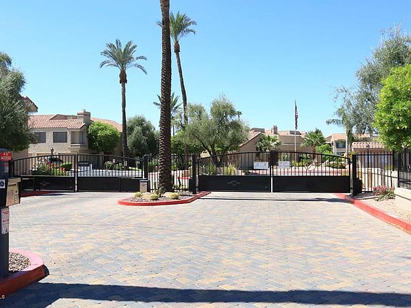 This very spacious and cut 1 bedroom unit on the first floor in this gated community with mature trees, lovely community pool area with spa and BBQ grills for your convenience. This unit has a one car attached with a direct entrance into unit. There is a storage unit on the patio. Very close to the Scottsdale Tennis Center, Senior Citizen, library, medical centers and directly across form the complex is Walgreens, Goldie's and more.