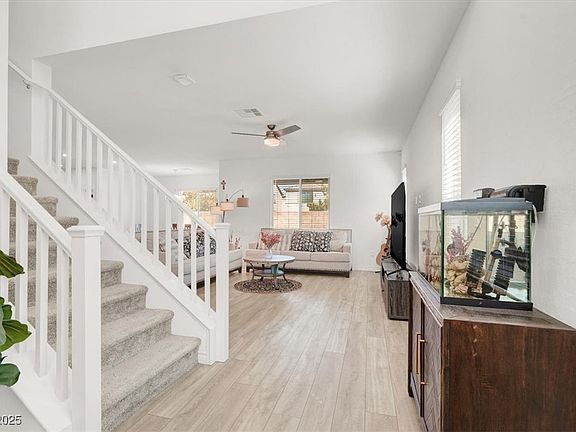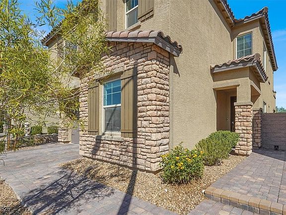 Stunning 4 bedroom home in gated community of the exquisite Skye Canyon with the amazing amenities including clubhouse, pools, workout facility, cafe and more! Wonderful open floor plan seamlessly connects the spacious living, dining, and kitchen areas, creating an ideal space for entertaining guests or enjoying quality time with family. The gourmet kitchen has a large center island, walk-in pantry, and plenty of cabinet & counter space. A guest bedroom with a full bath downstairs. The upstairs loft is perfect for use as an indoor recreational area or lounge, large primary bedroom features a balcony with beautiful mountain view, a huge walk-in closet, oversized bath with separate shower & tub. Beautifully landscaped backyard with covered patio and fire pit provides plenty of room for outdoor living or entertaining. Other features include: newer water heater, overhead storage in garage, Kinetico Water system, smart home features, and solar panels!
