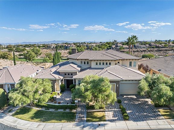 Oversized 3-car garage with 220v Tesla charger. Magnificent custom 6BR plus Den executive home, spanning 5600 sqft, nestled within the exclusive gated Summerlin community. Embrace the breathtaking Canyon views from every angle. Each of the 5 bedrooms is a private retreat, complete with its own bath. You'll find productivity at its finest in the expansive home office suite. Entertainment takes center stage with a massive 1000 sqft movie theater and game room, perfect for unforgettable gatherings. Prepare gourmet delights in the state-of-the-art kitchen, featuring lavish granite countertops, stainless steel appliances, and a walk-in pantry. The Master bedroom is an oasis of relaxation, boasting a cozy fireplace, patio access, and an extravagant master bath. Step outside to the meticulously manicured backyard, where a sparkling swimming pool awaits, overlooking the tranquil canyon and inviting walking trails.