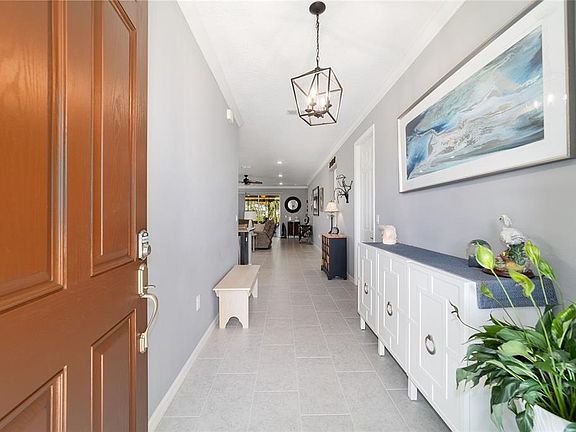 Modern conveniences meet stylish upgrades in this beautiful manicured corner lot Home. Enjoy a screened in extended lanai with 4 inch insulated roof, ceiling fans and shade screens. Extended driveway and decorative stone walkways. Additional perks include crown molding, plantation shutters, new electric rollup garage door screen, front storm door, reverse osmosis water system, Gutters, keyless garage and front door entry, Ring doorbell. This Home has the extras, move-in ready and full of charm.