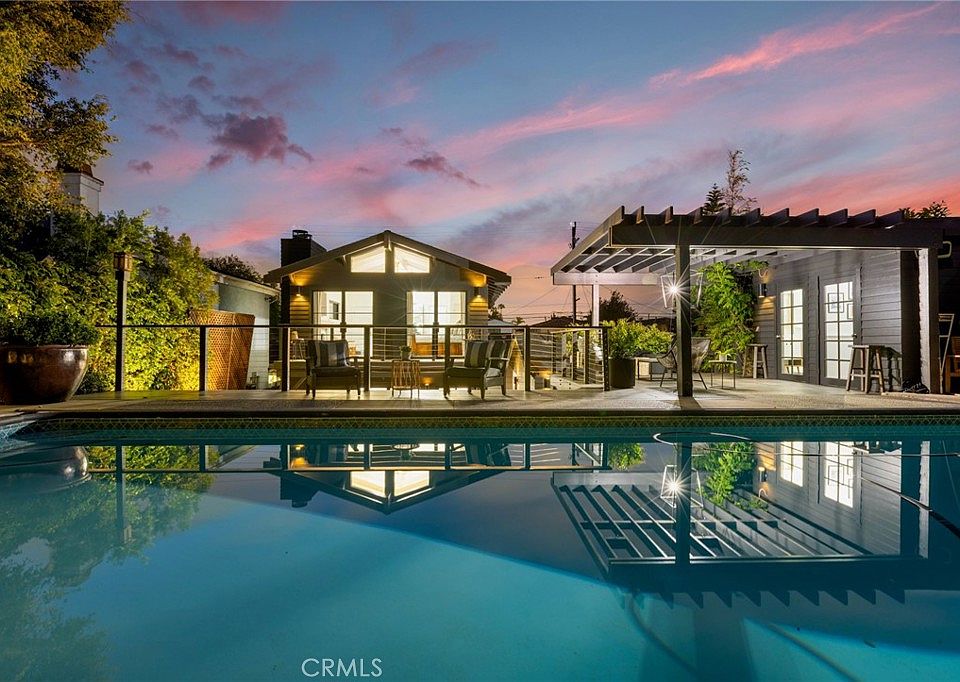 Step outside to multiple levels of outdoor living surrounding the rare large, deep pool perfect for gatherings or peaceful lounging. A detached pool cabana with bathroom, shower, and bar area adds convenience and comfort. Additionally, a freestanding 1-bedroom, 1-bath guest house doubles as a gym, art studio, office, or garage, offering adaptable space to suit your lifestyle.