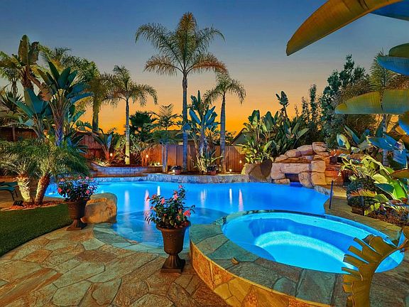 Welcome home to 1012 Cima Drive in coveted Discovery Hills of San Marcos. This move in-ready home has something for everyone. From the private, resort-like backyard with lush palms and tropical trees, to the spacious upstairs loft, this home is packed with sought after features and amenities. Let’s start with the location. Locals love Discovery Hills for many reasons. Freeway access, grocery shopping, medical care, eateries and entertainment, all are within just a few minutes when you live in Discovery Hills. One local favorite is Discovery Lake, and it is within walking distance. Put on your walking shoes and head over to Discovery Lake on a Sunday morning and you are sure to run into several others out with pets enjoying the paths or even fishing in the lake. One of my favorite features of 1012 Cima Drive is the cul-de-sac location. As you pull up you will notice the striking curb appeal, attractive front steps with no neighbors and direct trail access across the street. Step inside to a bright, flowing floor plan with new Bali blinds, ceiling fans throughout with formal living and dining rooms perfect for elegant gatherings. The separate family room features a stunning stone walled surround fireplace with custom built-ins, adding warmth and charm to the space. The large kitchen is a chef’s delight with ample cabinet space, sleek granite countertops, stainless steel appliances, a central island with stool seating, and a spacious walk-in pantry. Head upstairs to the large loft, ideal for entertaining or when you need a place to put kids, games, crafts, toys, or anything else you want to enjoy and keep out of regular sight. The primary suite is a true retreat with extra space for a sitting area or in bedroom office space. The primary bath includes a step in shower, large soaking tub, spacious walk-in closet with extra shelving, and updated mirror and paint with matching black hardware on all doors and cabinets. The generously sized secondary bedrooms are thoughtfully located near the conveniently placed hall bathroom. Venture outside to your private oasis, which is sure to be one of the most popular features. The centerpiece of the backyard is the custom built beach entry salt water pool and spa with slide, grotto, and waterfall enveloped in lush tropical landscaping and low-maintenance turf to help keep dirt and grass out of the pool. The large covered patio runs the full length of the back side of the home providing shade for sitting and entertaining while still letting ample light into the home. The backyard fencing has recently been replaced, and don’t miss the fenced off side yard, it makes a great dog run. Wow, what a home! 1012 Cima Drive is a very special place and we encourage all interested parties to come take a look right away before it is sold!
