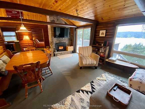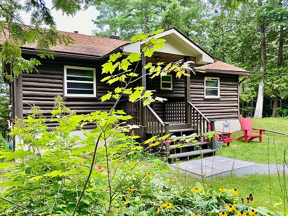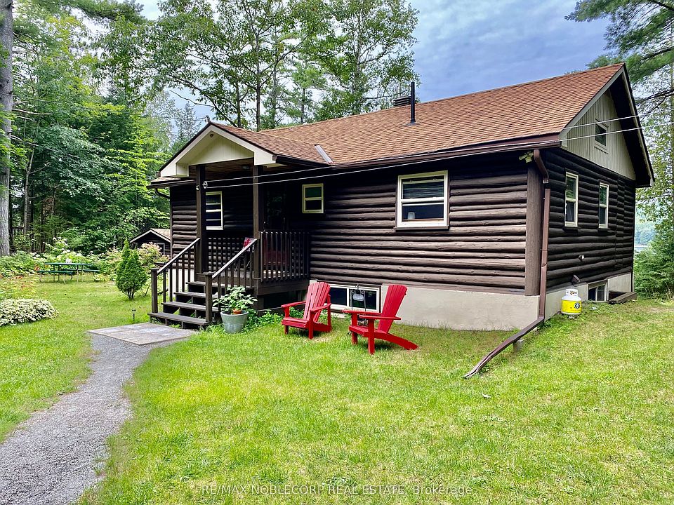2 for the Price of 1 A Rare Lakeside Offering! History, charm, and income potential all come together in this very unique property. Perfect as a year-round family cottage, a peaceful retreat for retirees, or an investment opportunity with approx. $50,000 annual rental income potential!The main residence is a fully winterized 2 bed / 1 bath log home with a partially finished walkout basement. Showcasing timeless round-log construction and a stunning stone fireplace, the spacious kitchen, dining, and living areas are ideal for entertaining. Step out onto the large deck and soak in the panoramic lake views. The lower level features a welcoming family room with another fireplace, a den, full laundry, and plenty of storage. Recent upgrades include a new propane furnace (May 2021). Stroll down to the waterfront and relax on the oversized dock, perfect for swimming in the clean, deep waters of Gooderham Lake, enjoying watersports, fishing, or even boating into town for groceries and ice cream. Adding incredible value is the historic 550 sq. ft. self-contained guest cabin. With 2 bedrooms, a full washroom, cozy woodstove, and its own private deck and dock, its the perfect haven for visiting family or rental guests. A 23x16 detached garage and large storage shed complete the package. With year-round access just minutes to the village of Gooderham, this is a rare opportunity to own a versatile property that blends lifestyle and investment.