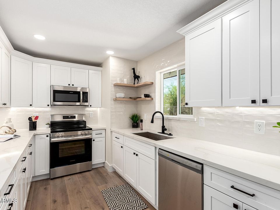 This stunningly REMODELED home is ready to move in! Featuring 3 beds & 2 baths, it seamlessly blends modern comfort and style. Its charm starts with NEW windows, two RV gate, & a 2-car garage. The inviting interior boasts fresh neutral paint, vaulted ceilings, new ceiling fans in every room, new recessed lighting, tons of natural light, & luxury new wood-look tile flooring. Enjoy the semi-open layout, ideal for both privacy & connection! The renewed kitchen has SS appliances, quartz counters, white shaker cabinetry, & a subway tile backsplash. Den with a barn door entry & sliding doors to the back! Perfectly sized bedrooms with closets, and main & secondary bathrooms have been updated as well. The large backyard, with a patio is ready for your creative outdoor oasis!