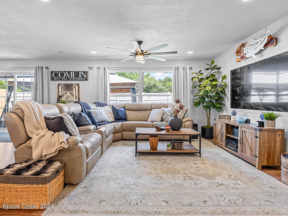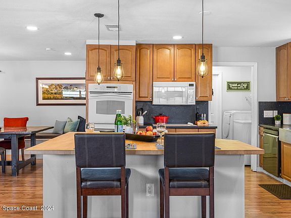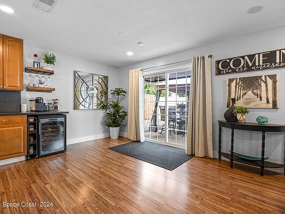 From the minute you arrive at this lovely, spacious home you'll feel the peaceful, open atmosphere and envision family cooking times together at the large butcher block topped kitchen island looking out over the living room. Luxuriate in your extra large primary ensuite including closet walk-in, boasting built-ins with ample drawers and counters. This joins to an updated bathroom with seamless glass shower and tower with jets, wand and rain shower top, all separated from the bedroom with attractive barn doors! Back in the main living area, you'll love entertaining times in this open floor plan that flow into the private, fenced back yard; and the convenience of life just minutes away from I95, great for commuting and access to Orlando. Other favorite details will be your very close proximity to grocery and convenience stores, great for busy lives; the nearby ice plex for ice skating fans; Viera for shopping and dining out. Roof and HVAC are both 2019. Life is good here!
